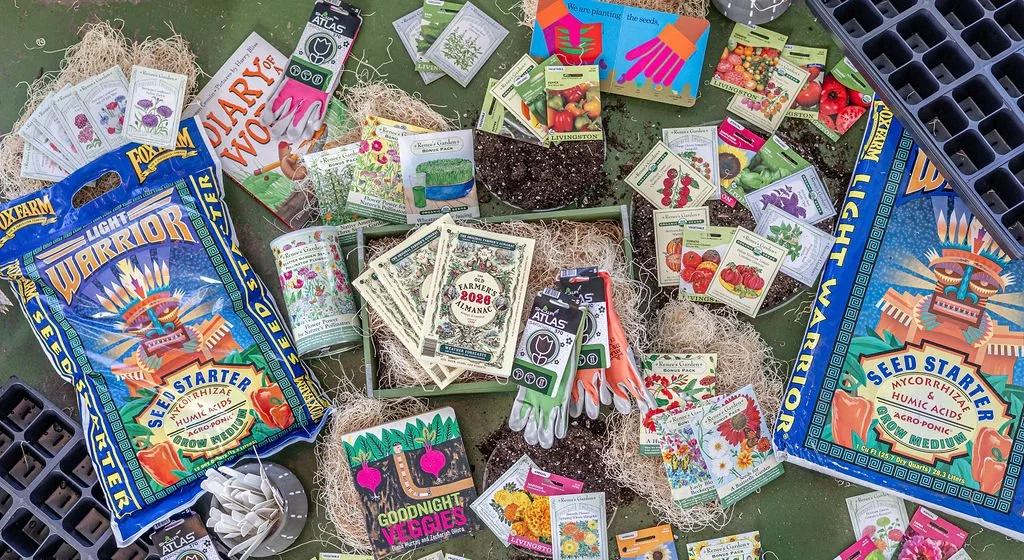 We offer seed packets and bulk supply as well as garden tools. If you have birds, we have resources for you as well!
